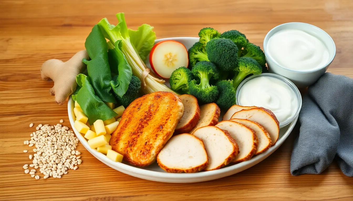 Incorporating specific foods can create a barrier against acid reflux. Oatmeal serves as a soothing breakfast choice, absorbing excess stomach acid. Ginger provides anti-inflammatory properties and can easily enhance various dishes. Lean proteins, such as chicken and fish, improve digestion without adding fat. Vegetables, like broccoli and green beans, promote overall health and minimize discomfort. Yogurt, with its probiotics, fosters gut health and can help balance acidity in the stomach. Whole grains and non-citrus fruits also support a healthy digestive system and should occupy plate space.